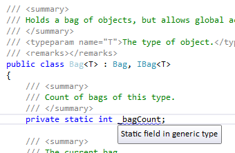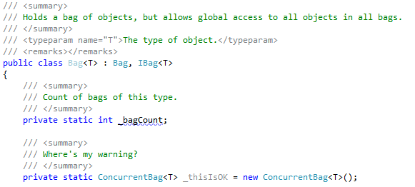Should we just ban statics in generics and be done with it (easier said than done)? Well the answer to that is complex, but there are some really good examples of where it is very useful, some of which I’ll show you in future posts, the important thing is to remember that the static is only global to the closed generic type. In our example ‘_bagCount’ will only be global to ‘Bag’, a ‘Bag’ will have it’s own ‘_bagCount’ static. When you understand the limitation, you can also understand it’s usefulness.