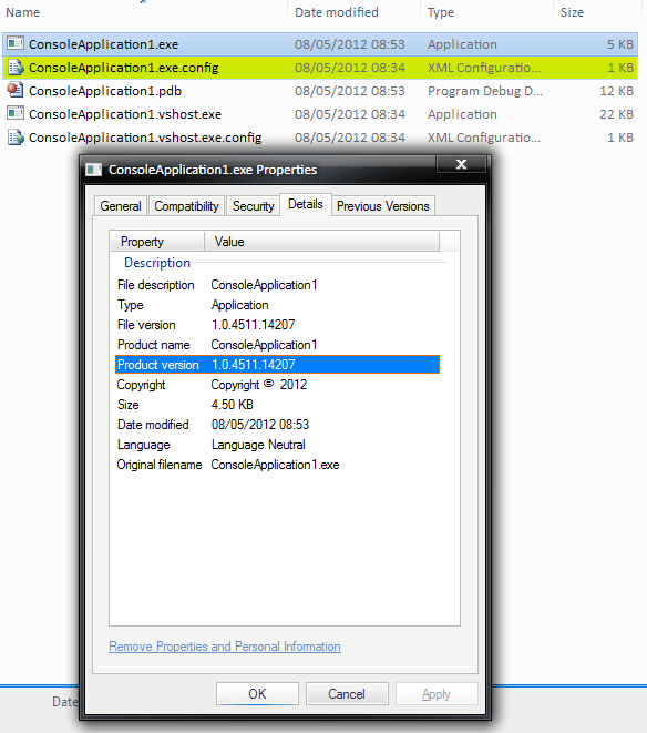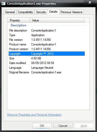 So what happens if we build our console application – well we get a nice executable file and if we browse to it and open up the file’s properties pane we can see the following on the details tab: