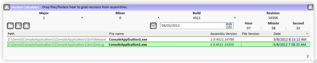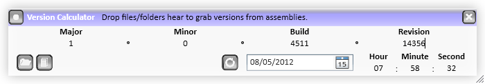 After a lot of internal debate about using things like revision numbers from source control systems (which we did for a while) or using invalid version numbers like 1.0.20110508.75832 (each element is supposed to be a 32-bit integer), I threw together the above little utility to allow easy conversion between the default version number and the actual date and time. So from our original example, you can see the date was today (8 May 2012) and the time was 7:53AM (notice the last updated was 8:53AM because of daylight saving)
